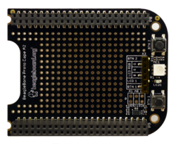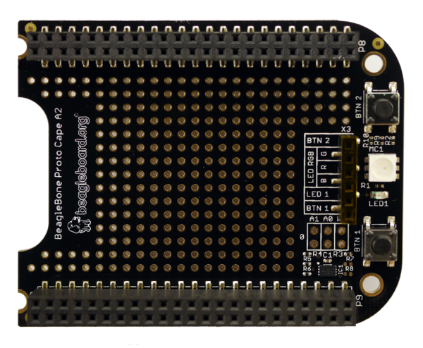 Provides a blank slate to design any type of application that you can imagine. Along with plated through-holes for external component soldering, there are a few on-board components, such as buttons, a multi-colored LED, and a basic LED to assist in the design process. The ID EEPROM is also capable of having the address be re-assigned to allow for a seamless integration into the BeagleBone cape schema.
